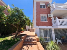 The lower floor of the house features a large bright living room and separate kitchen. It opens up onto a spacious, partially covered terrace overlooking the golf course and the well maintained communal gardens. There is parking right outside the front door for easy access. A convenient guest toilet completes the ground floor.