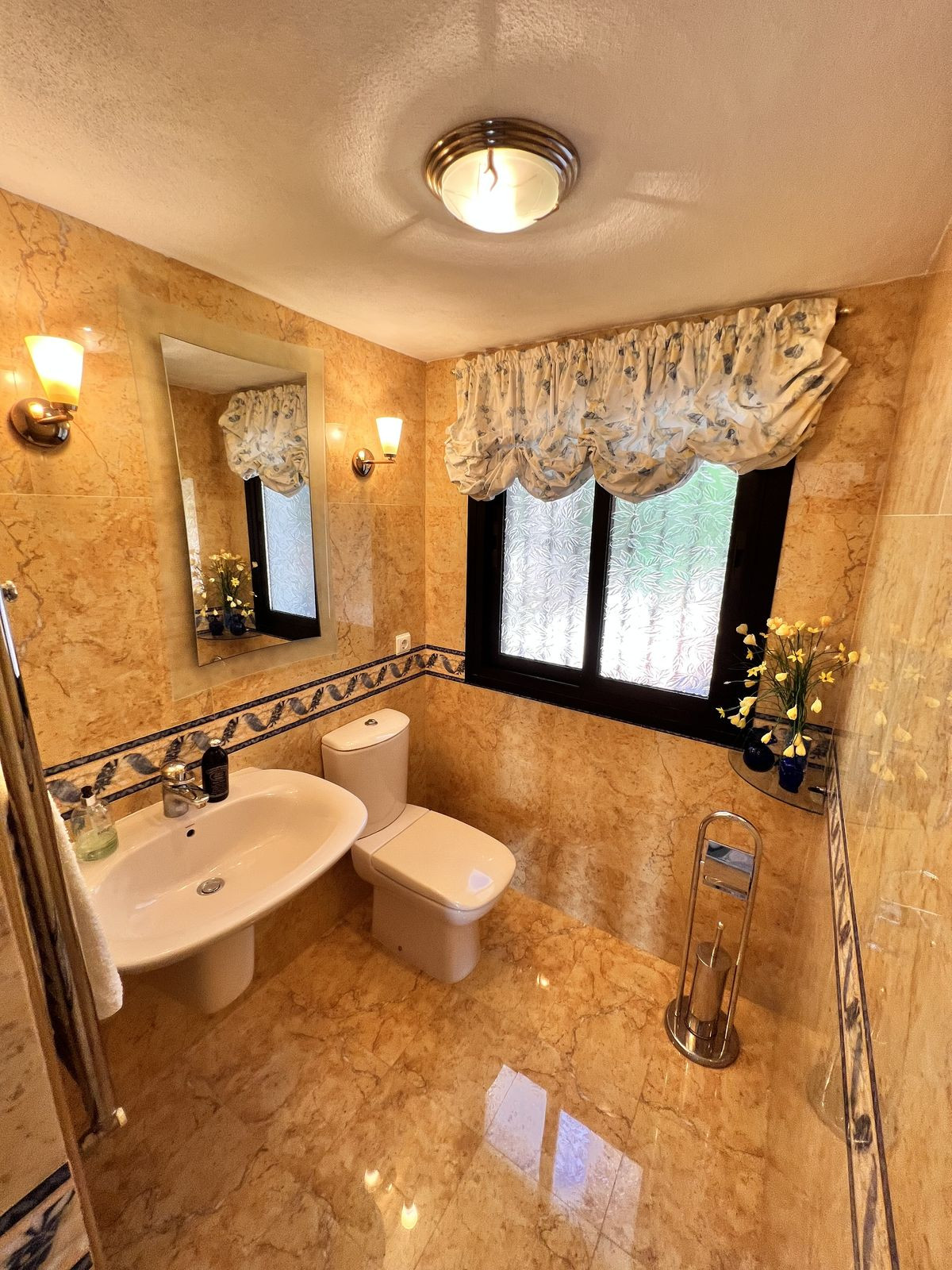 To the back of the kitchen, via stable doors, is access to a delightful and spacious courtyard with a cactus garden, a large tiled wall mural, and additional storage and access to the garage. Returning to the villa, there is a Master bedroom with fitted bespoke furniture, a walk-in dressing room, and an en suite bathroom. There is also access to the terrace. Off the dining area is a lovely covered terrace with fabulous views including built-in seating with a marble-topped table and steps leading to the garden and pool. From this terrace is a lift with direct access to the level below.