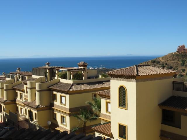 This spacious and bright apartment has a lot to offer. When you enter you have a large semi open kitchen on your left. There is a large sunny living area with a fire place that leads out to the terrace with mountain and sea views. There are two large bedrooms and 2 bathrooms of which one ensuite. This apartment has easy access and parking right outside the block. The urbanisation has a lovely pool area with lush gardens. There are a few restaurants are within walking distance and a bus stop is right in front of the block.
