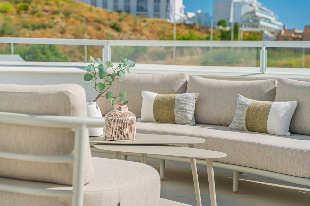 Discover this stunning second-floor duplex penthouse, offering breathtaking panoramic views of the sea and mountains. The home features a spacious living room terrace and a rooftop terrace with a private solarium and elegant white pergola, perfect for enjoying the Mediterranean sun in complete privacy.