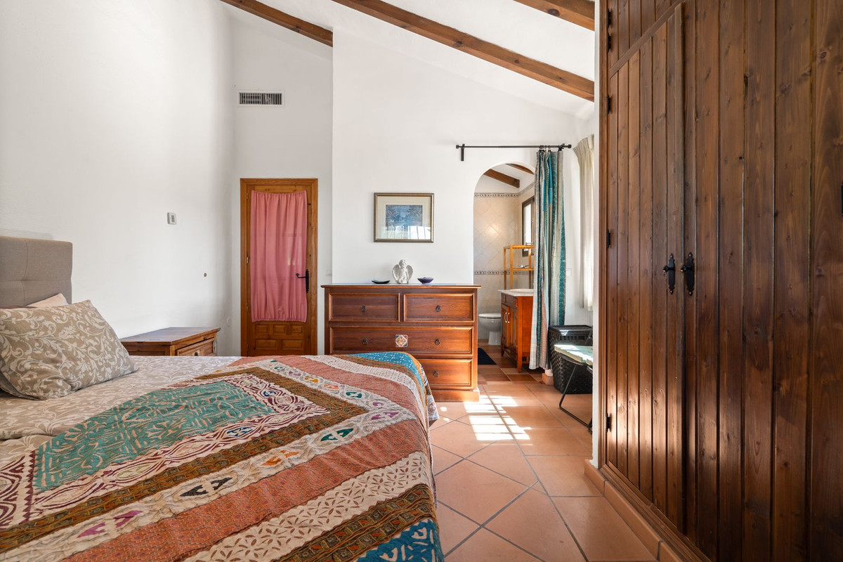 This single-level villa has a practical, flowing layout yet showcases the authentic charm of a country retreat. Details such as vaulted and beamed ceilings, rustic stonework, and decorative wrought iron add warmth and personality. A separate guest suite, accessed via an exterior staircase from the patio, provides privacy for visitors. The elegant driveway, olive trees, water features, and orchard create the feel of a miniature finca.