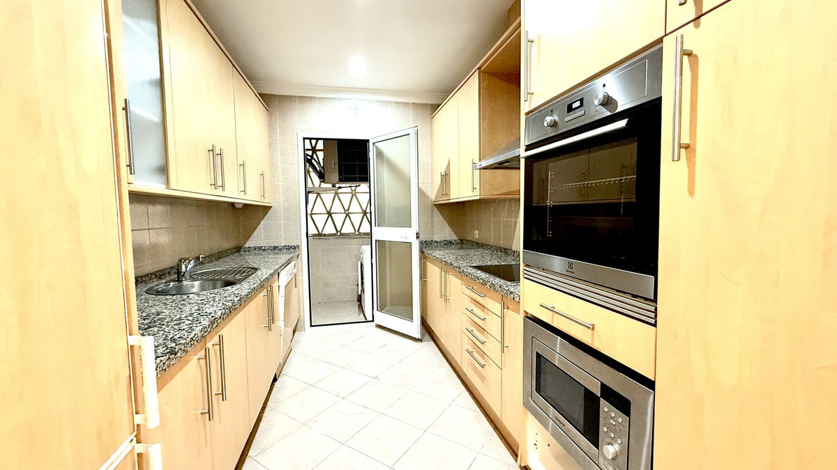 The fully equipped kitchen is separate and includes a utility area. Thanks to its elevated position, the apartment enjoys privacy and open views, while still benefiting from easy access to the communal gardens and pool area.