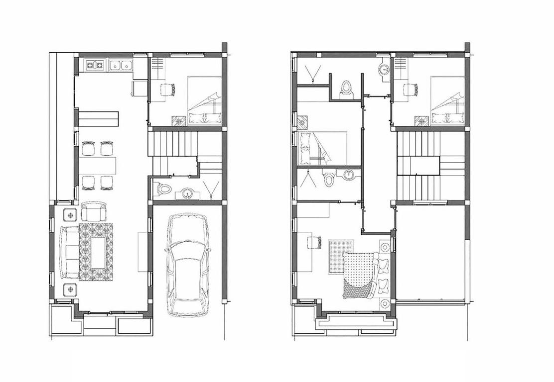 The upper floor comprises three bedrooms (one with a dressing room) and two full bathrooms, providing a cozy and well-distributed relaxation area for the whole family. Finally, the tower floor (12 m²) houses the staircase leading to the rooftop terrace, providing additional space with multiple uses.