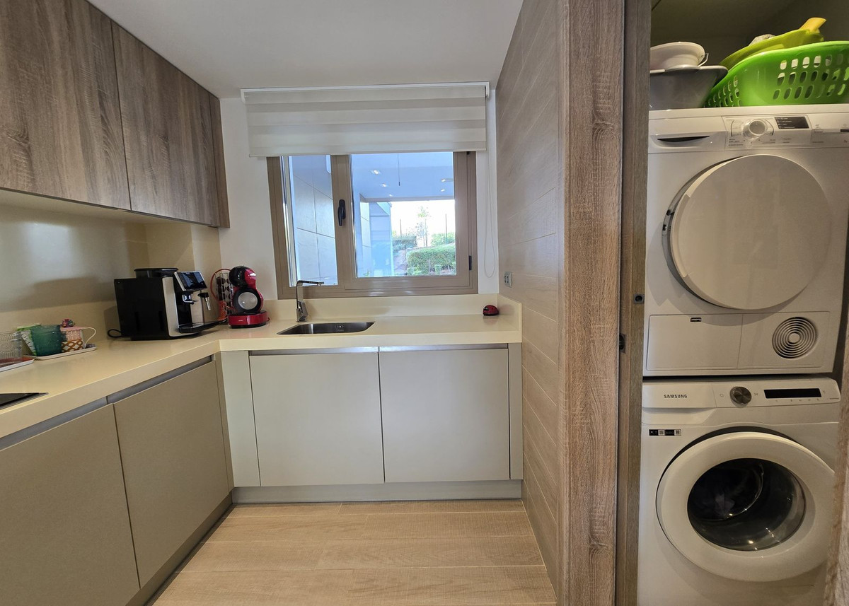 The apartment features a spacious and bright living-dining room that opens seamlessly onto the terrace, creating a perfect indoor-outdoor flow for relaxation enjoying breathtaking views over the golf course. The fully equipped kitchen, with a sleek resin worktop and adjoining laundry room, adds both style and functionality. Bedrooms are spacious with large wardrobes and equipped with tilt-and-turn aluminum double-glazed windows and electric shutters, while air conditioning (hot & cold) and energy-saving solar thermal hot water ensure modern comfort.