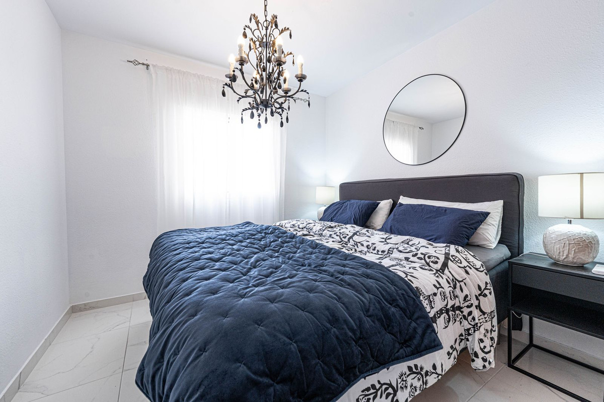 The apartment features two bright bedrooms, one elegant bathroom, and an additional guest toilet. The interior combines Scandinavian lightness and Mediterranean warmth, with premium materials and a modern design that floods the space with natural light.