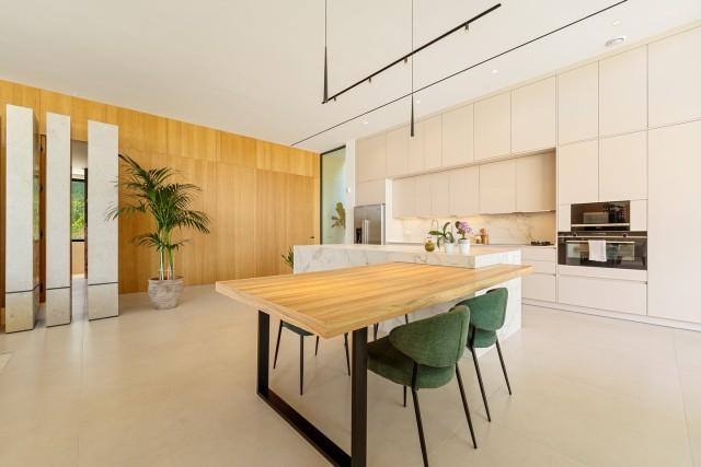 The main level is designed for seamless indoor-outdoor living. A spacious open-plan lounge and dining area flows directly to expansive terraces and the pool. Floor-to-ceiling glass doors maximize natural light and create easy access to outdoor dining and lounge zones. The fully equipped designer kitchen, double-height ceilings, and thoughtful layout make the home ideal for both relaxed family life and stylish entertaining.