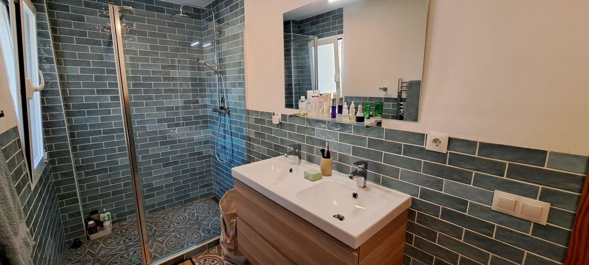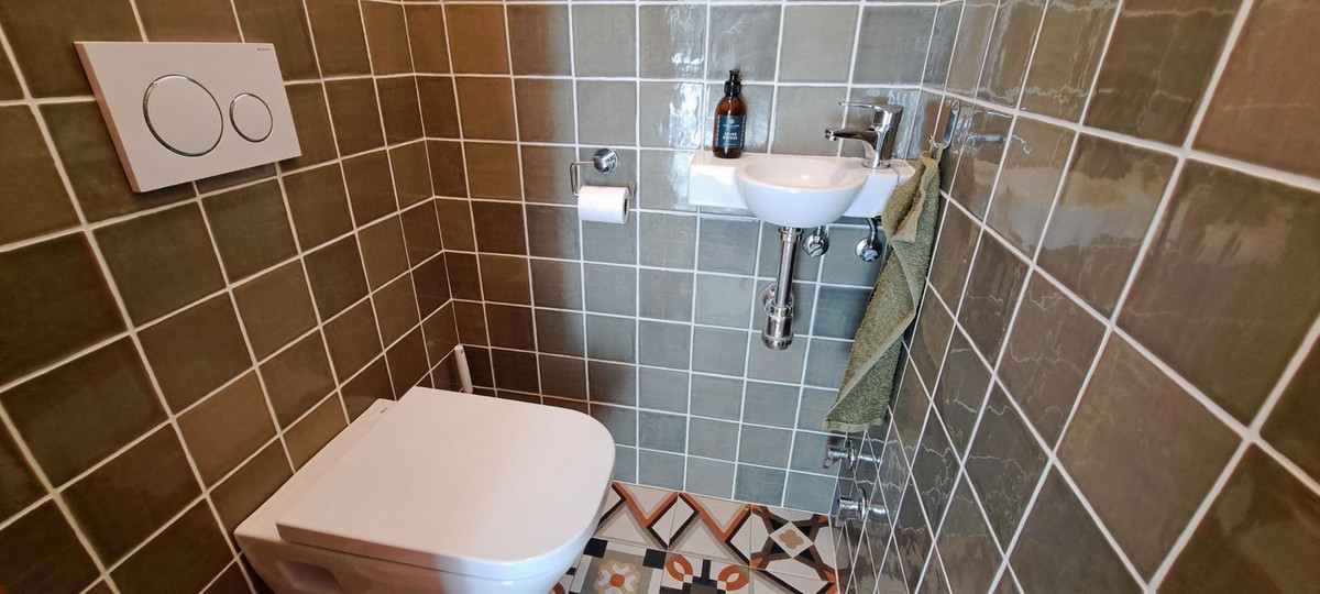 On the other side of the house, we enter the bedroom area. The first two bedrooms are spacious and equipped with modern air conditioning. These two bedrooms share a modern bathroom with a sink and spacious walk-in shower in the middle. The toilet is located in a separate room, equipped with a sliding door to make optimal use of the available space.