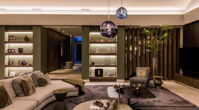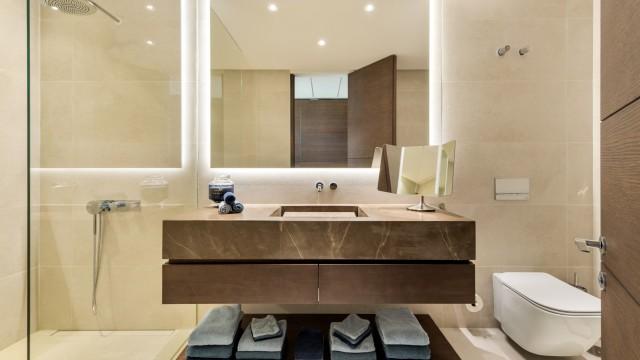 In the living area, silent electric pocket windows disappear neatly into the stone cladded walls to take us to the generous floating terrace where we can embrace the magnificent view of the Mediterranean and the Golf Course. This level of the villa is also home to the luxurious principal bedroom with private terrace, en suite bathroom and private dressing room.