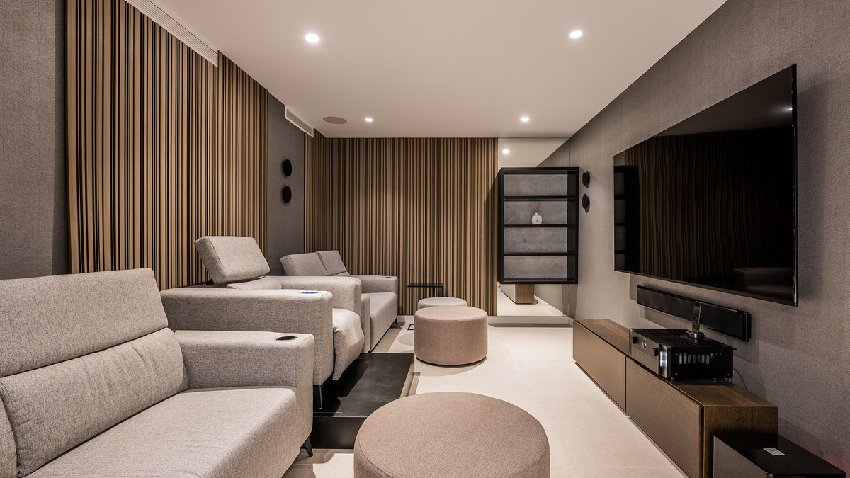 The lower level of the home includes two additional bedroom suites, a guest toilet, cinema room, utility room, and a private garage for two cars.