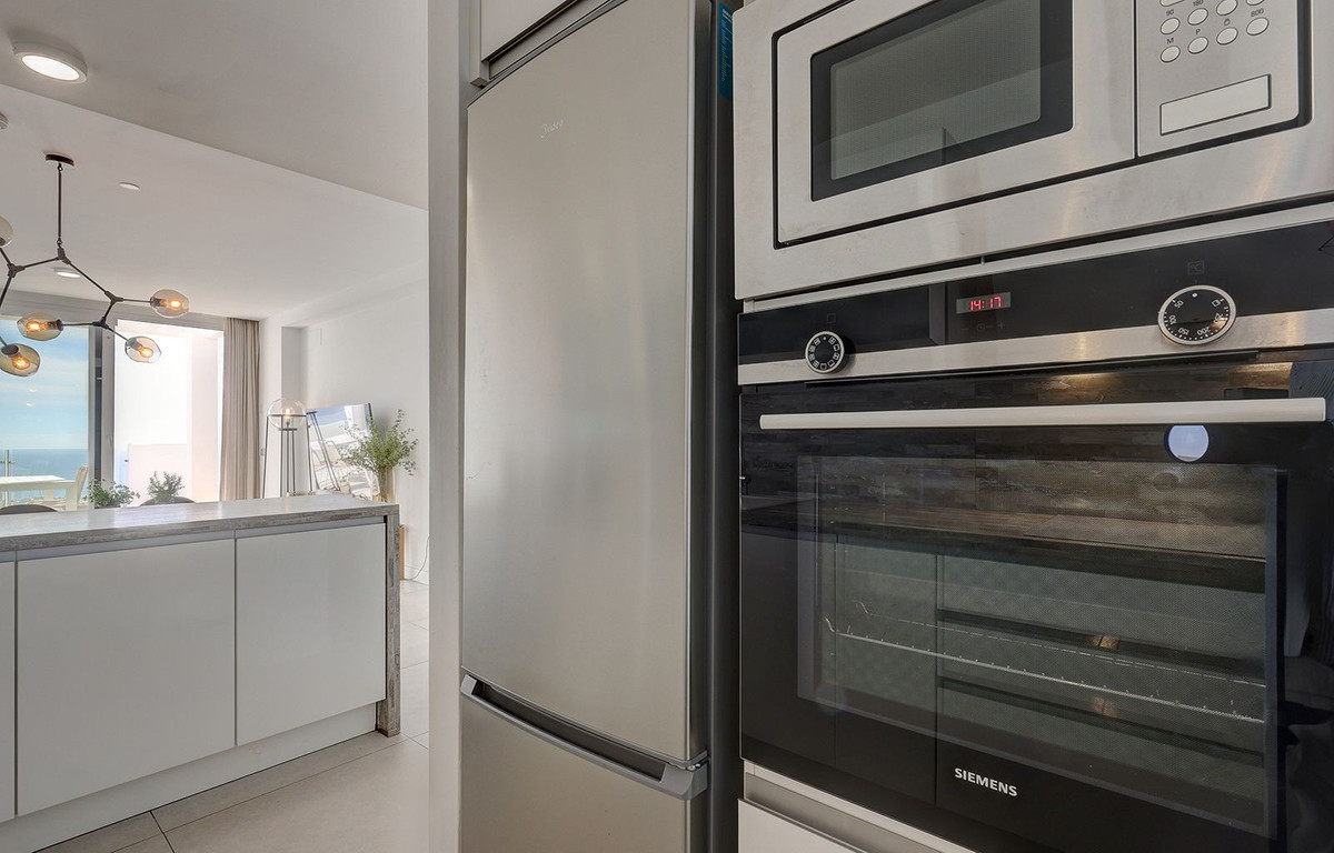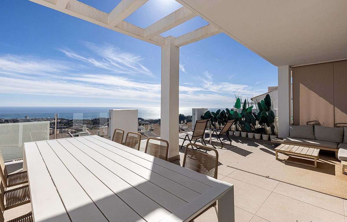 This elegant duplex penthouse enjoys stunning panoramic sea views and a prime location in Benalmádena, just a short drive from the beach and the picturesque village of Benalmádena Pueblo.
