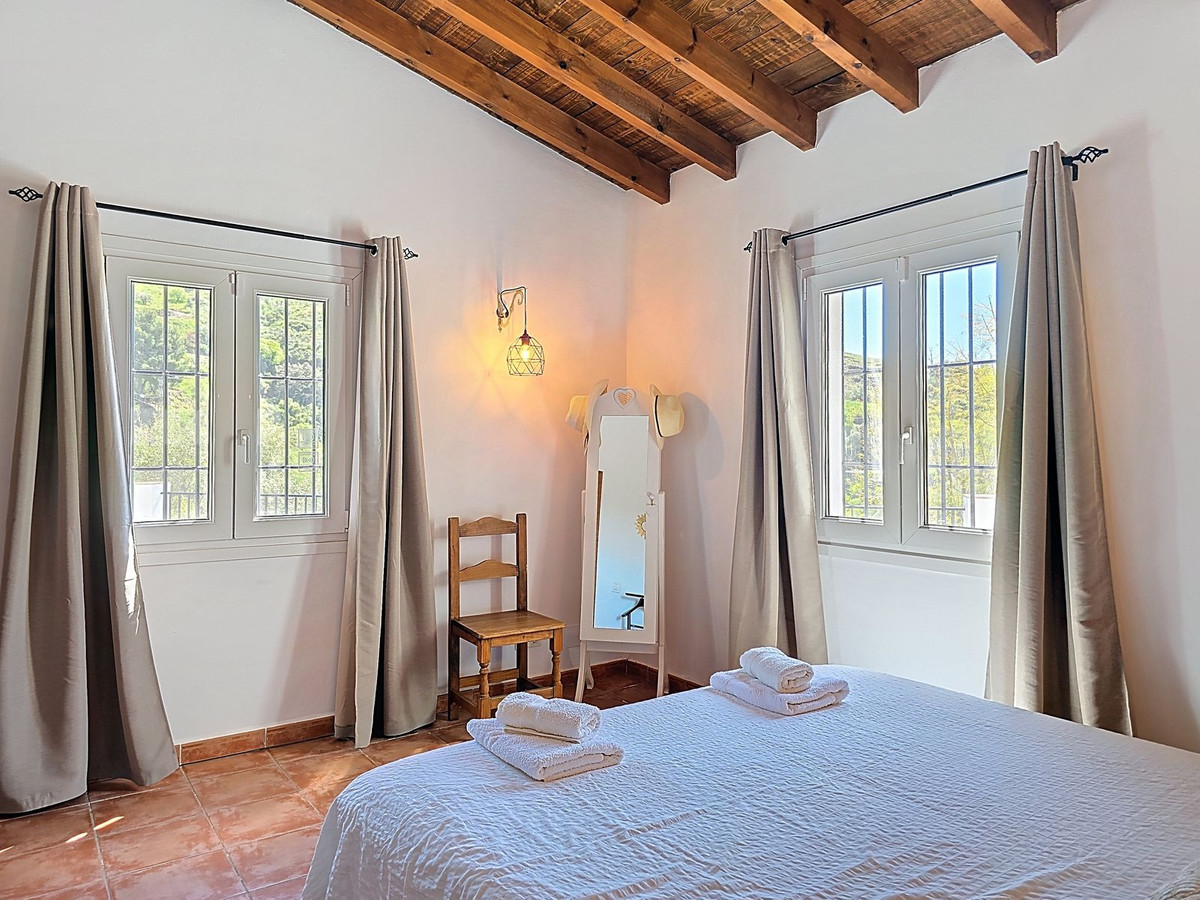 The property offers three well-proportioned double bedrooms, each with built-in storage and views of the surrounding countryside. One of the bedrooms benefits from an en-suite bathroom, providing added privacy and convenience. A second, family-sized bathroom is finished with traditional Andalusian tiles and stylish fixtures, offering a bright and functional space for residents and guests alike.