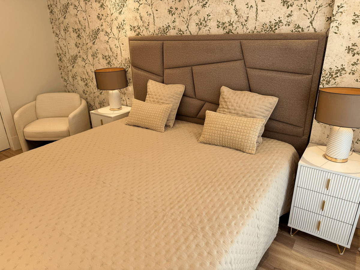 Fully renovated apartment in an urbanization Las Petunias Del Mar, second line beach, steps from the renowned Paseo Marítimo de San Pedro with its restaurants and beach clubs. This ground floor apartment consists of 2 full size bedrooms, 2 bathrooms, a living room with an open kitchen and a private garden. 92 m2 inside and 41 m2 outside. Refurbished to a very high standard, the promoter changed and improved everything, including pipes, electricity, air conditioning and windows with electrical shutters. The property is being sold fully furnished and decorated, key ready