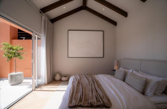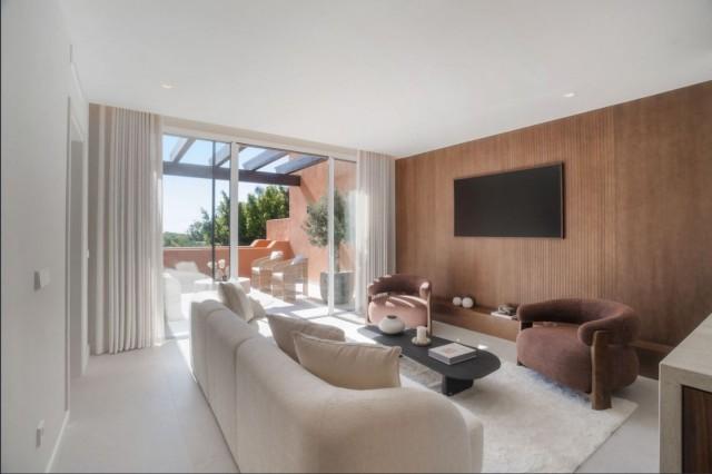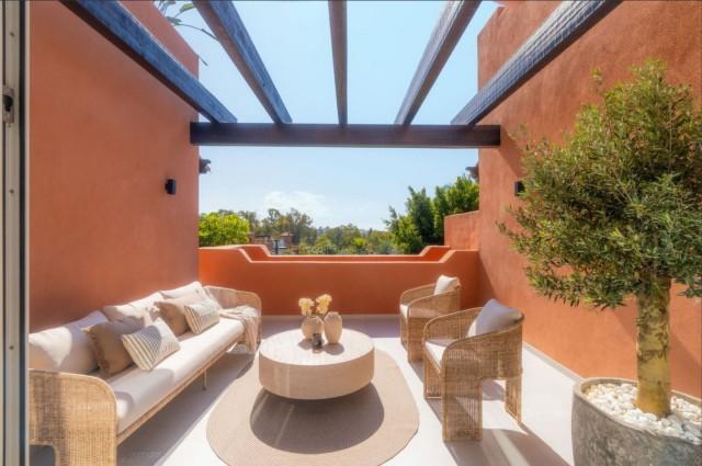 We present this elegant duplex penthouse located in a gated community in Nueva Andalucía. This recently renovated property offers four bedrooms and three bathrooms, with high-end finishes. The first floor features a modern kitchen with Miele appliances and a spacious living-dining room with access to a terrace overlooking La Concha beach and the Mediterranean Sea.