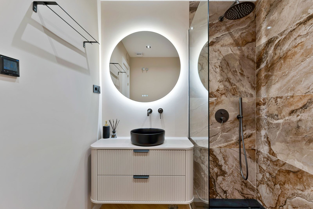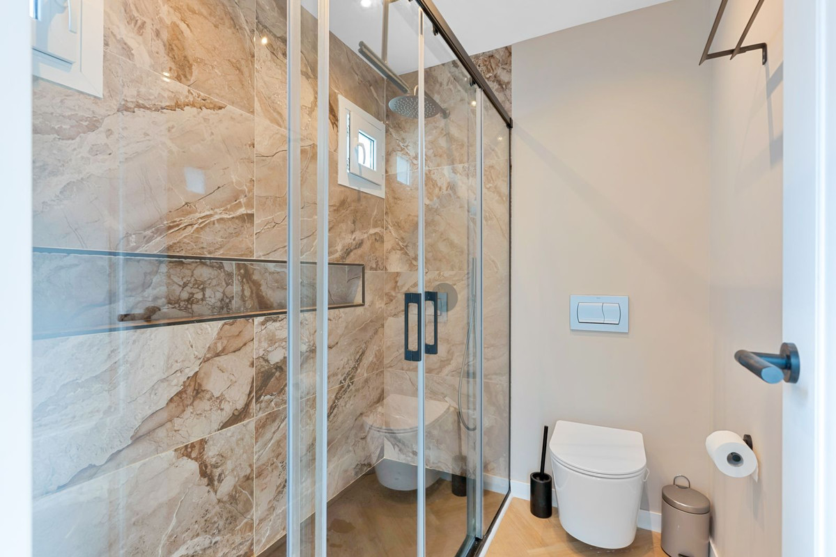 The top floor offers a generous 20 m² bedroom with ensuite bathroom designed for full privacy and comfort. Large windows offer breathtaking panoramic views, filling the space with natural light and creating a seamless connection to the outdoors. The suite is complemented by two terraces. One terrace overlooks the communal swimming pool with stunning sea views, while the second terrace offers stunning mountain views of La Concha ideal for enjoying both sunrise and sunset in complete privacy.