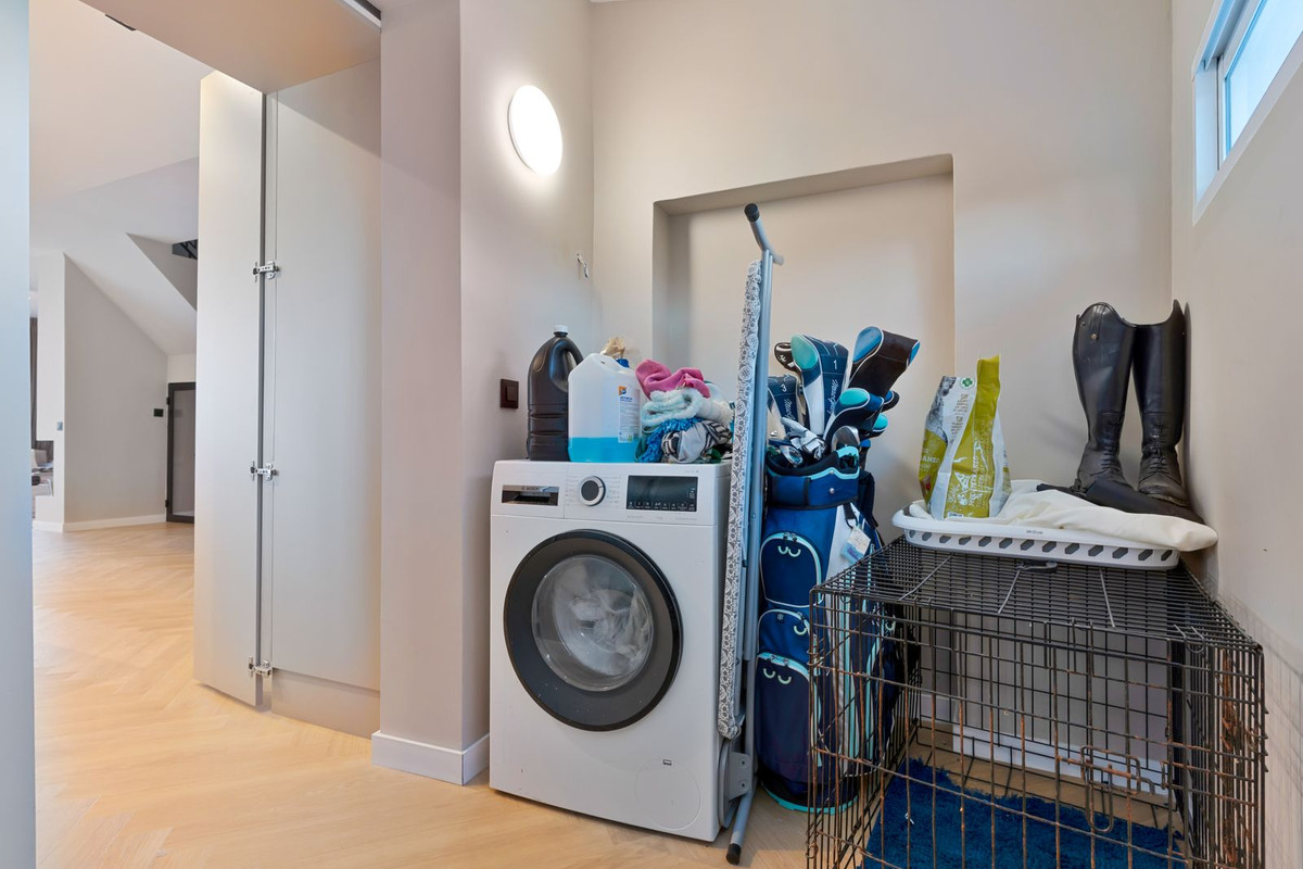 A dedicated space with a steel-framed glass door has been prepared for a temperature-controlled wine cabinet positioned under the stairs, providing a unique and elegant feature for wine enthusiasts. Practical storage and a washing machine are discreetly located behind the kitchen area, keeping the space uncluttered. A separate guest toilet with a sink is conveniently located for visitors. The living area connects beautifully to the outdoor spaces, featuring a private terrace at the entrance and an additional private terrace at the rear, directly accessible from the dining area, offering a perfect connection to the outdoor area and the communal swimming pool.