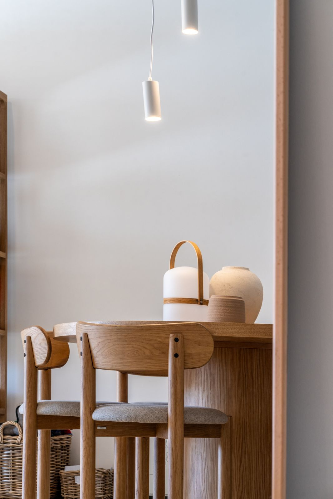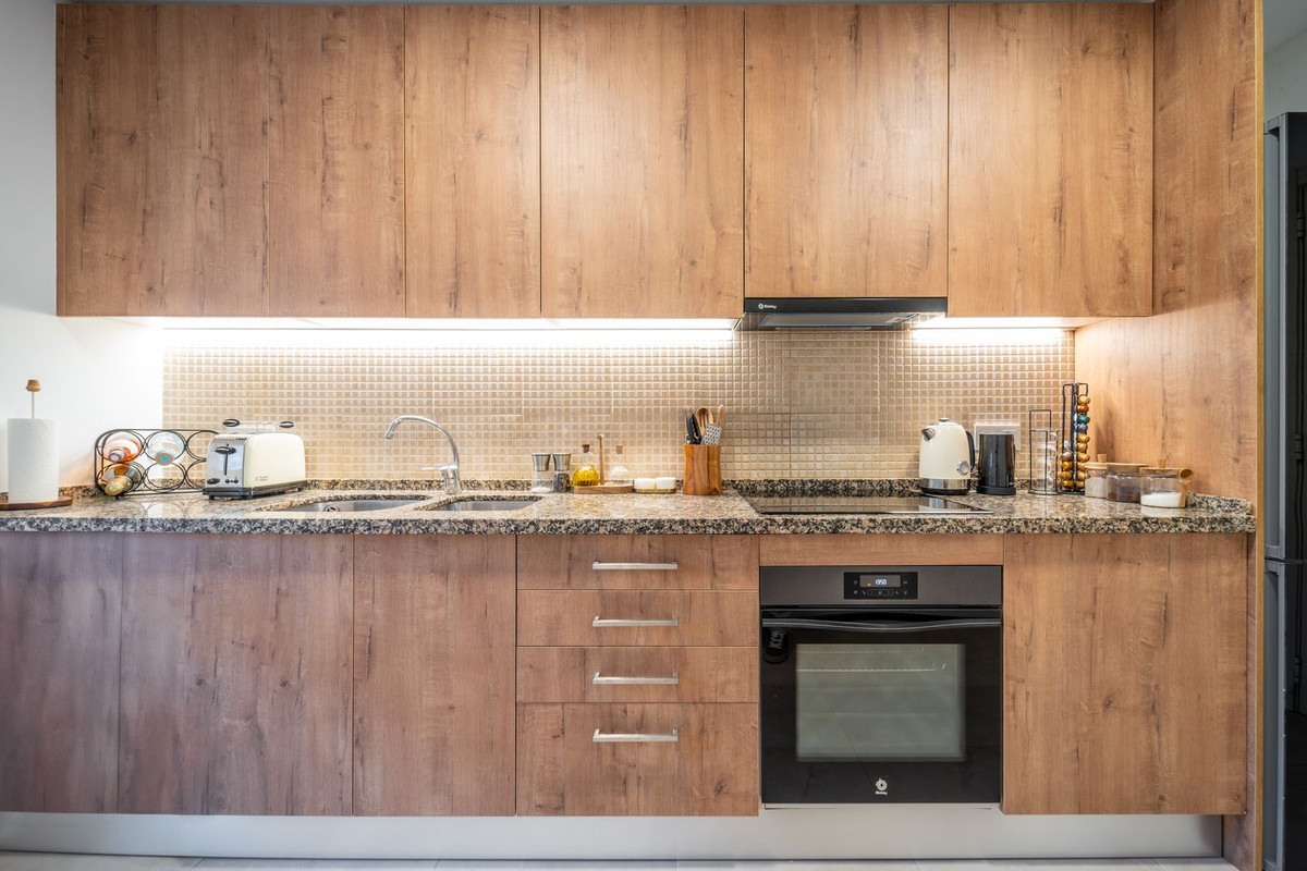 The open-plan living and dining area features soft neutral hues, warm wood accents, and sleek contemporary finishes, flowing effortlessly onto the expansive terrace—ideal for outdoor dining or relaxing while enjoying the lush green surroundings. The fully equipped kitchen combines practicality with modern design, while both bedrooms provide peaceful sanctuaries, including a spacious master suite with its own en-suite bathroom.
