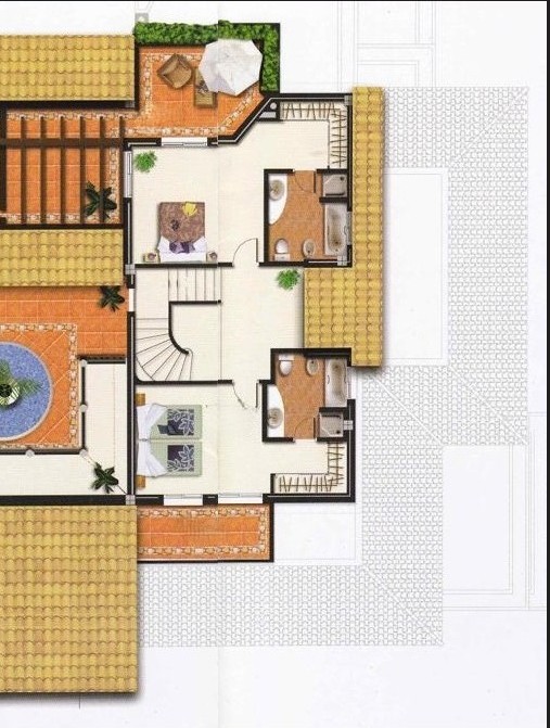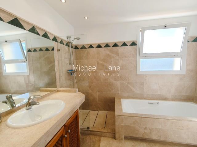 The property offers three generous en-suite bedrooms, all with direct access to terraces. The master suite features a walk-in wardrobe and open views. On the entrance level, one bedroom opens onto the large main terrace, while the remaining two bedrooms are located on the upper floor, each enjoying its own private terrace, ensuring privacy and independent outdoor spaces.