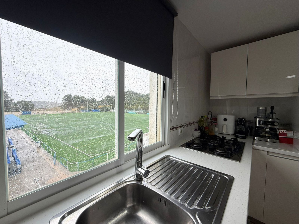 The kitchen enjoys open views over the football field, providing natural light and a pleasant sense of space. It also includes a separate laundry area, adding extra practicality to daily living.