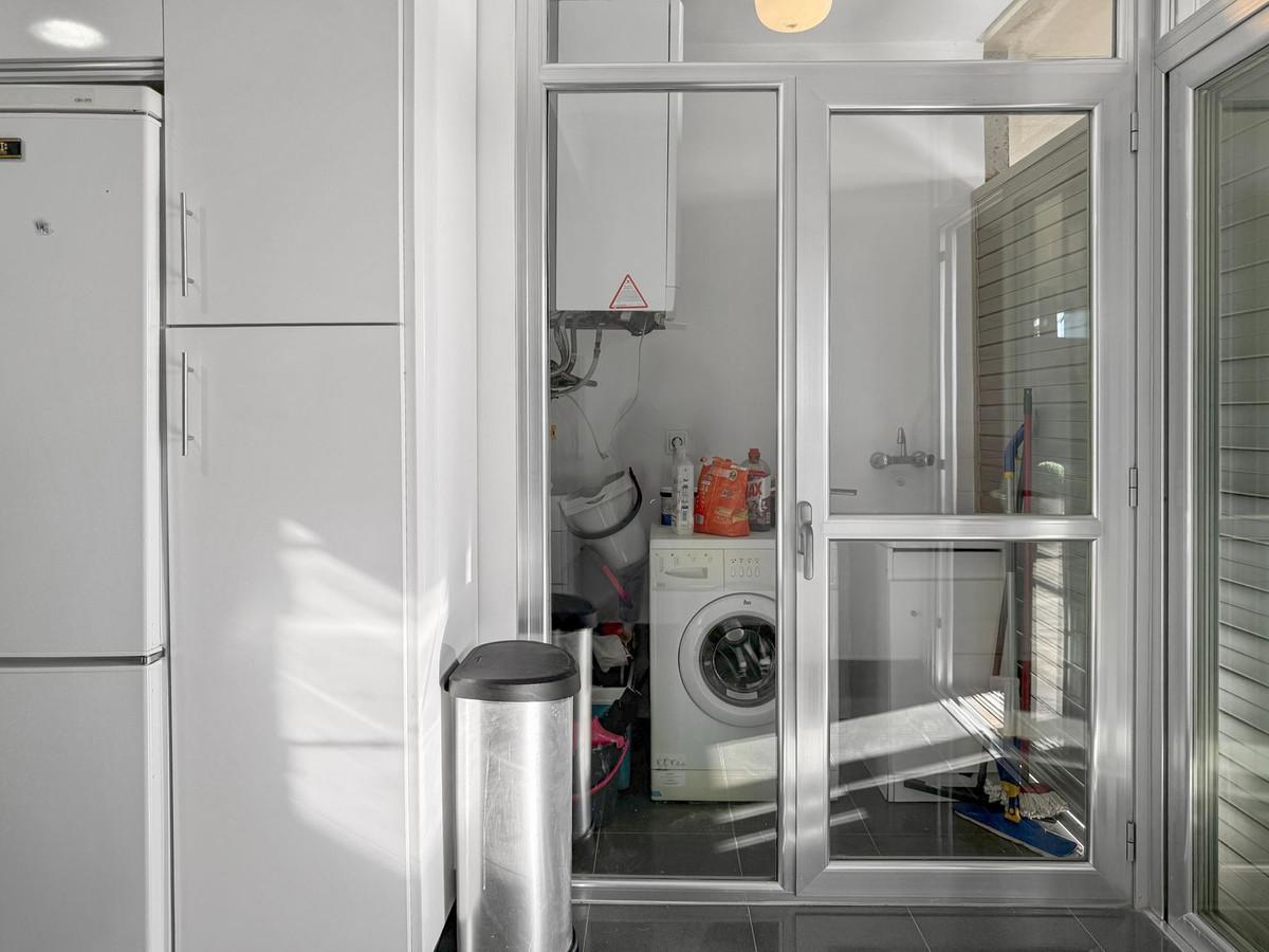 The property welcomes you with an entrance hall featuring built-in wardrobes, leading into a spacious and bright living-dining area. This space opens onto a spectacular private covered terrace with premium teak wood finishes, where breathtaking panoramic sea views can be enjoyed.