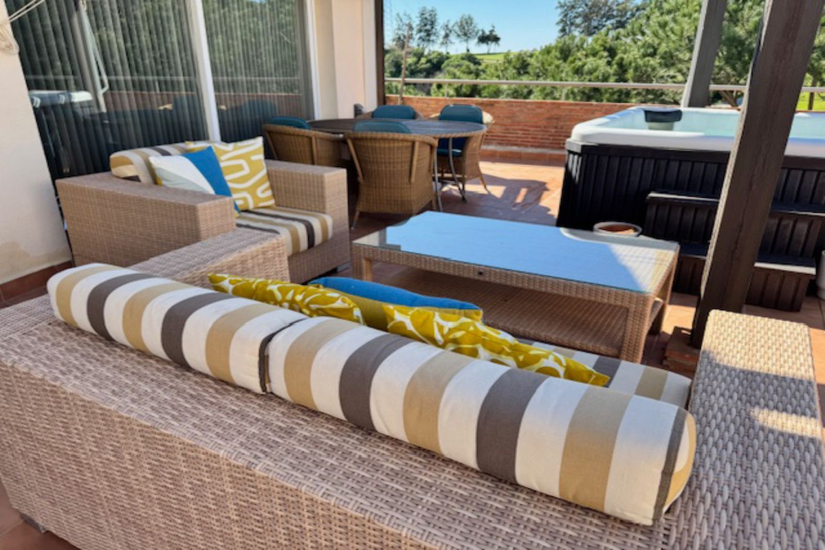 This bright unusually large 2 bedroom luxury, south facing penthouse is situated within the exclusive, beautifully kept, luxury complex in Riviera del Sol next to the prestigious Miraflores Golf Club House.The property consists of a very large lounge/diner, a fully fitted open plan kitchen, 2 double bedrooms, 2 bathrooms (one en-suite) and a large wrap around terrace which boasts lovely views of golf, mountains and the community gardens.The lounge boasts beautiful large floor to ceiling glass patio doors on 2 sides and the master bedroom has large mirrored fitted wardrobes as well as patio doors leading onto the terrace. This apartment is finished to a high standard, with marble flooring throughout, fully tiled marble bathroom, air con (H&C), video entry phone, Satellite TV, alarm etc. This peaceful complex has beautiful, very well maintained tropical gardens which includes a water / pond feature. It also has a large pool with bar prep area, a separate children's pool, a gymnasium and sauna. The apartment comes with underground parking space and storage.