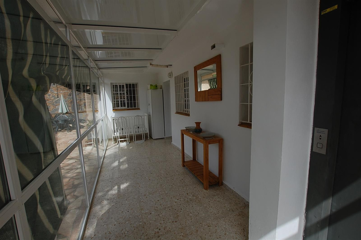 A large villa in a quiet cul de sac in the Urbanisation of Campo Mijas with a large walled and gated garden with ample parking space for 3 or 4 cars . The property is entered via a gated entrance way to the large parking area with easy access to the house. On the upper ground floor there is a pool, barbecue and a sun terrace leading to the entrance hallway, a large open plan living/dining room, second lounge with a fireplace, master bedroom with large shower room, second bedroom with ensuite, large kitchen with separate office/dining area with access to another large sun terrace. The living room also has direct access to themain covered and open terrace, barbecue , bar and pool with open panoramic south west views over the valley . The lower floor is reached via a staircase and has two further bedrooms with access to the lower terrace ,a conservatory, a large shower room and further bedroom with ensuite shower room which has its own private terrace adjacent to the main pedestration entrance . There are ample landscaped gardens for easy maintenance and behind the house there is a large wooden chalet currently used for storage. The property is in a great location and is within easy access to all the amenities of El Coto. There are open panoramic views from the front terraces and pool area, the house is fully air conditioned and will be sold part furnished. The property has an extra bonus of an elevator . solar panels and is suitable for the disabled and eldery as well as a great family or holiday home.