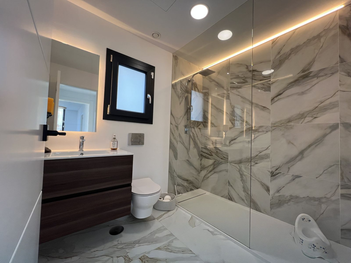 The upper floor comprises the master bedroom with built-in wardrobes and en-suite bathroom, as well as a second bedroom, also with fitted wardrobes and its own en-suite bathroom. From this level there is access to a spacious roof terrace with open panoramic views.