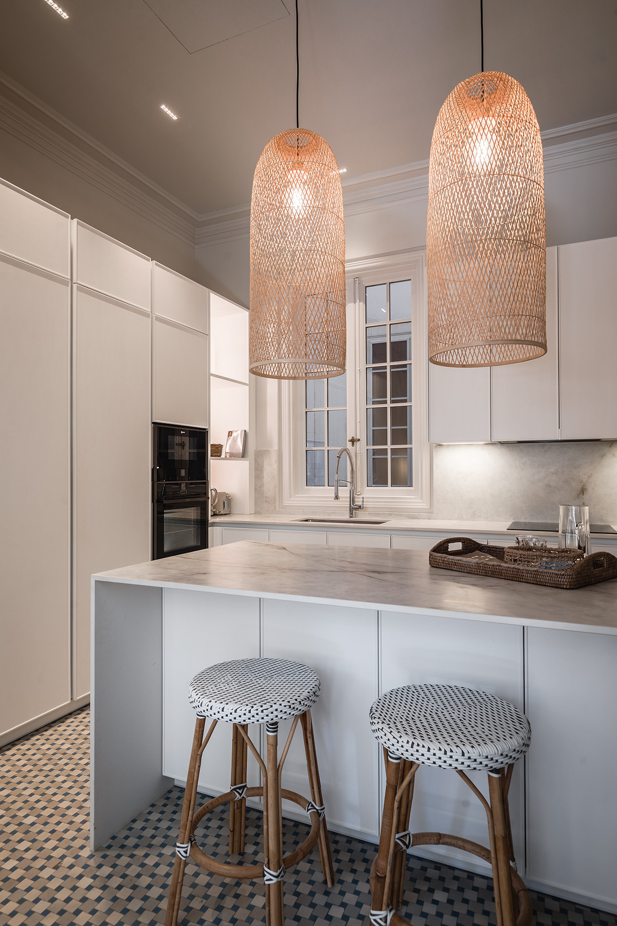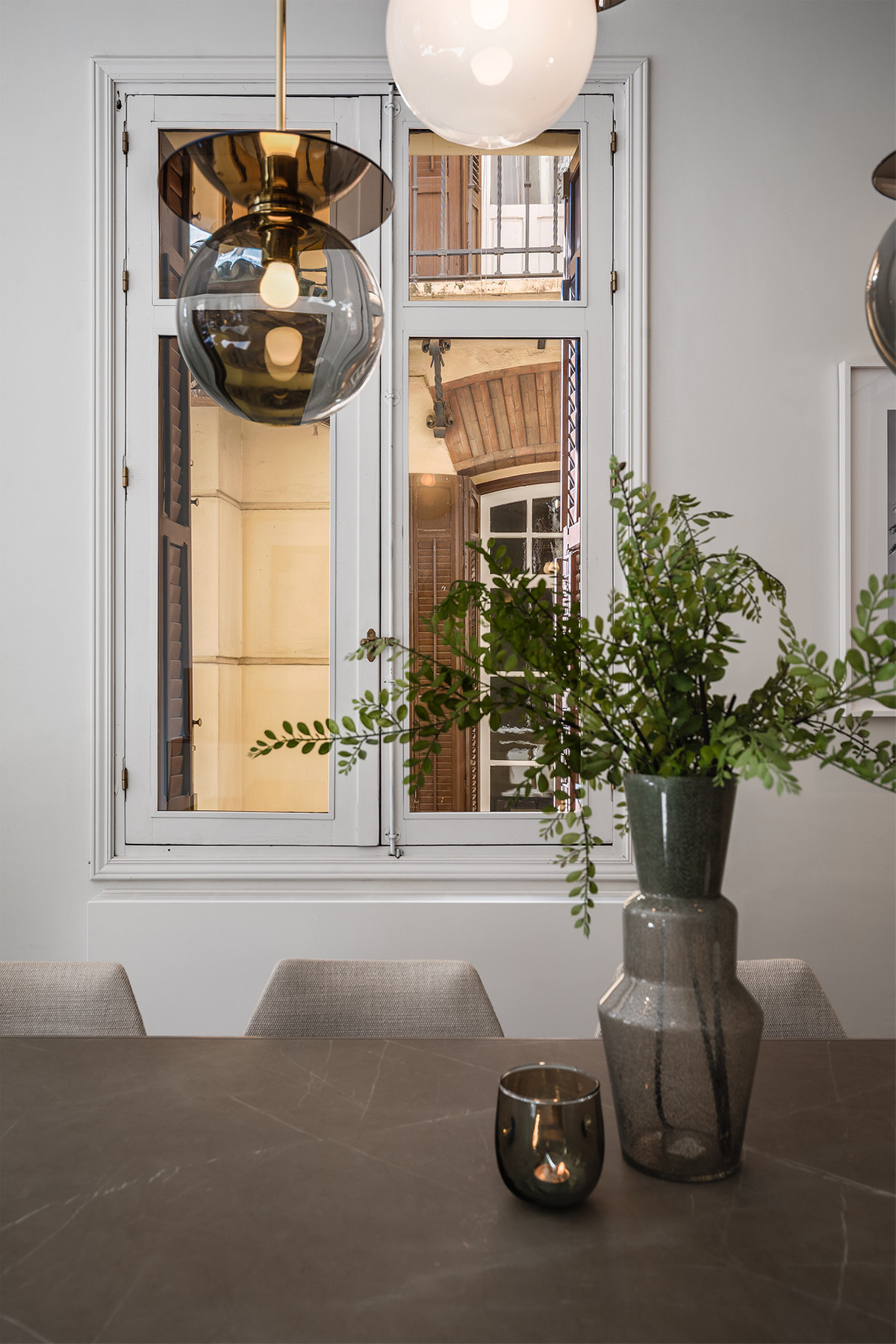 This impressive residence skillfully blends the classic elegance of its original architecture with a serene and luminous contemporary interior design. High ceilings, original moldings, and large windows harmonize with pure-lined furnishings, noble materials, and a carefully curated selection of lighting fixtures, creating an atmosphere that is both sophisticated and natural.