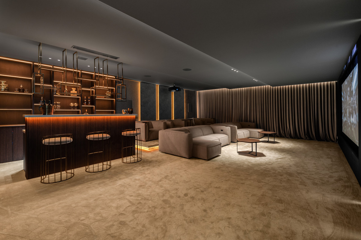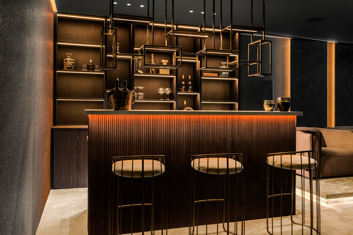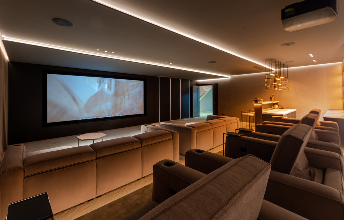 The lower floor offers an extraordinary luxury cinema room, a chic bar perfect for entertaining, a fully equipped Eleiko gym, a rejuvenating sauna, a private office for ultimate productivity, two additional guest bedrooms with en-suite bathrooms, and an expansive garage offering space for five cars, all designed with the finest attention to detail.
