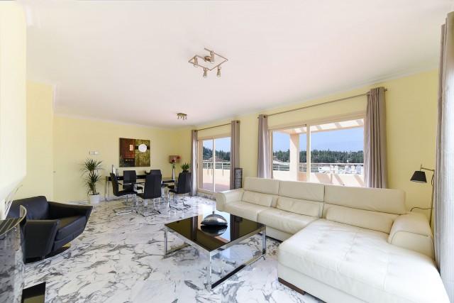 Luxurious and spacious penthouse apartment with 3 bedrooms, 2 bathrooms, pool and childrens pool. Located very quietly in Myramar del Sol on the 4th floor though near to all amenities and near the Mediterranean sea in Mijas Costa. The Myramar shopping Center is just at walking distance. The penthouse has a very generous terrace with panoramic sea views. The kitchen is fully equipped. Central airconditioning hot/cold throughout the whole penthouse. 24 hrs security around the whole complex. There is a communal parking space. Supermarket, bar, restaurant and bus stop at only 400 meters walk. The beach is at 450 meters. Fuengirola is only 10 minutes drive and Marbella 20 minutes.