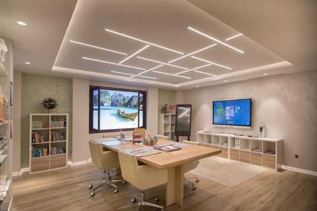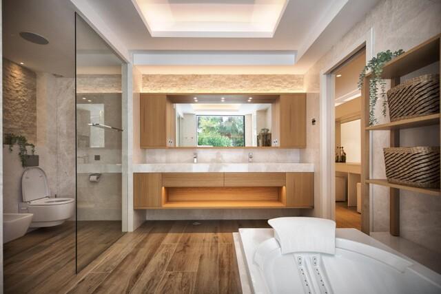 The main villa features seven spacious bedrooms, all designed with refined elegance and en-suite bathrooms. The interiors are defined by impressive volumes, including a spectacular split-level living room with ceiling heights reaching over four metres, enhancing the sense of space and natural light. Large glass openings connect the interior with generous terraces and beautifully landscaped gardens.