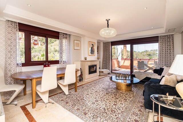 Stunning penthouse duplex in El Mirador del Golf in El Soto, La Mairena. The apartment offers two bedrooms, two bathrooms, a new and modern fully equipped kitchen, ample living room with access to a magnificent glazed and covered terrace with beautiful views over the golf course to the mountains and also partially to the sea on the main floor. On the upper level there is a large master bedroom with walk in closet and large bathroom. Also there is a spectacular partially covered and glazed terrace with BBQ area. Marble floor throughout, electric blinds, AC hot and cold and many more features. Also including underground parking space and storage room.