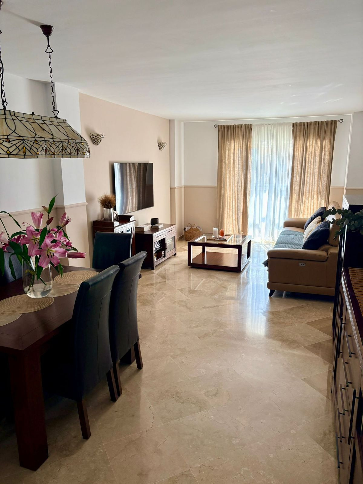 The living room is bright and welcoming, with direct access to a generous south-facing terrace, perfect for enjoying the sun all year round.