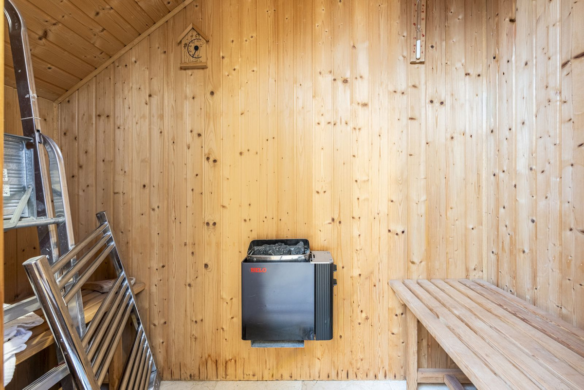 A staircase leads up to the loft level, where the bedroom is privately tucked away. This floor also features a bathroom and a private sauna, adding a touch of luxury and spa-like comfort to the home. The open design of the loft creates a warm atmosphere, making it the ideal place to unwind after a day in the lively town.