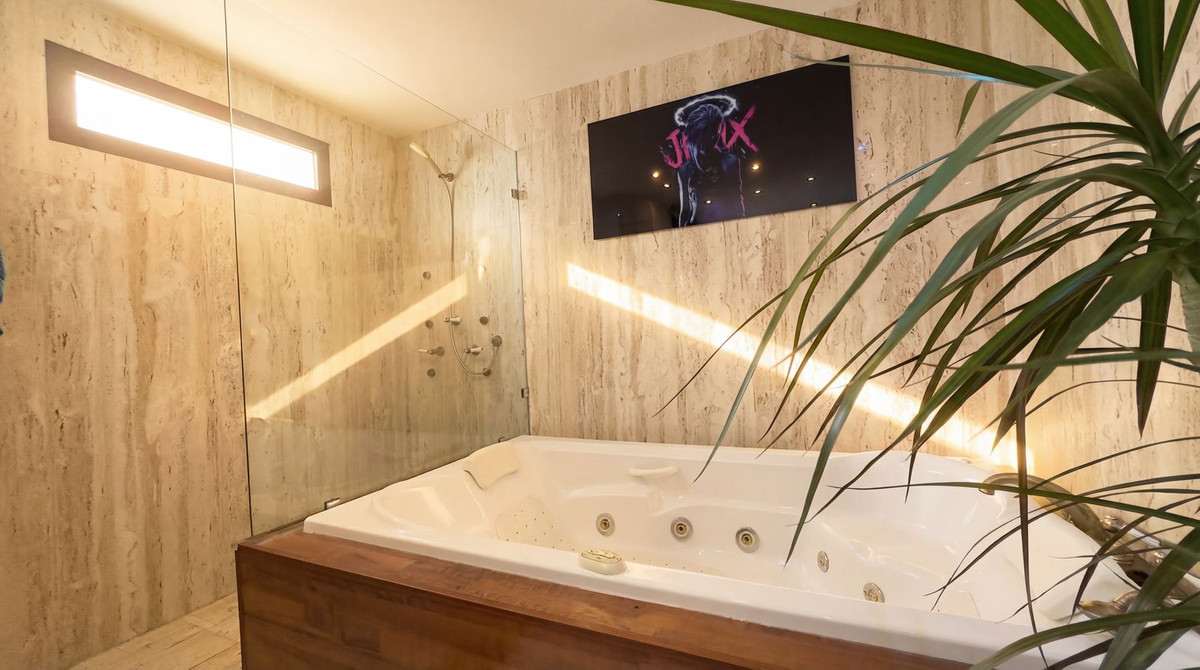The bathroom offers a sense of luxury and relaxation, featuring a generous jacuzzi bath and a modern walk-in shower, finished with natural stone-style walls—an ideal space to unwind.