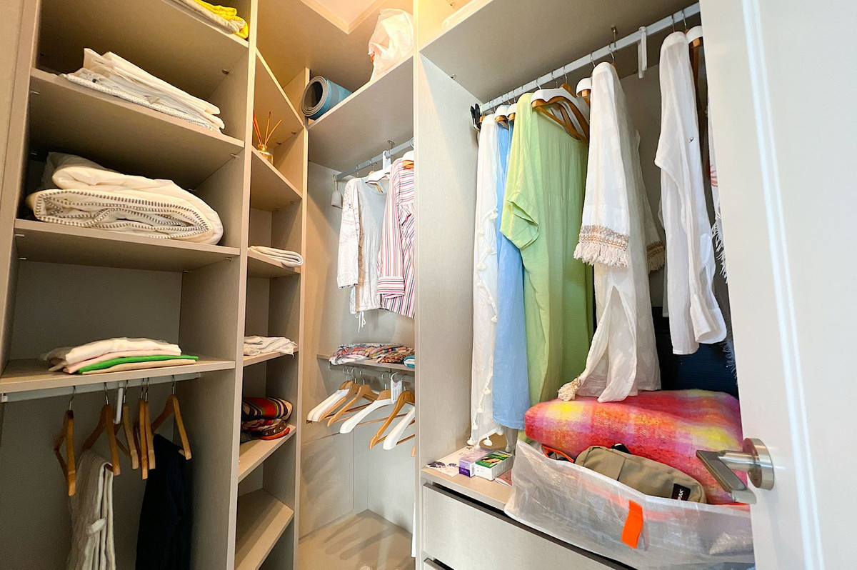 The en-suite bathroom with double sink, shower tray, bidet, and bathtub is very complete. The dressing room has enough space to store many clothes.