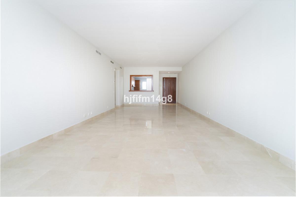 The apartment features a bright and well-proportioned living and dining area, designed for both relaxation and entertaining. The kitchen is fully independent, maintaining a sense of separation while remaining conveniently connected to the living space through a practical serving hatch. From the main living area, there is direct access to a private terrace, ideal for enjoying the warm climate of Nueva Andalucía throughout the year.