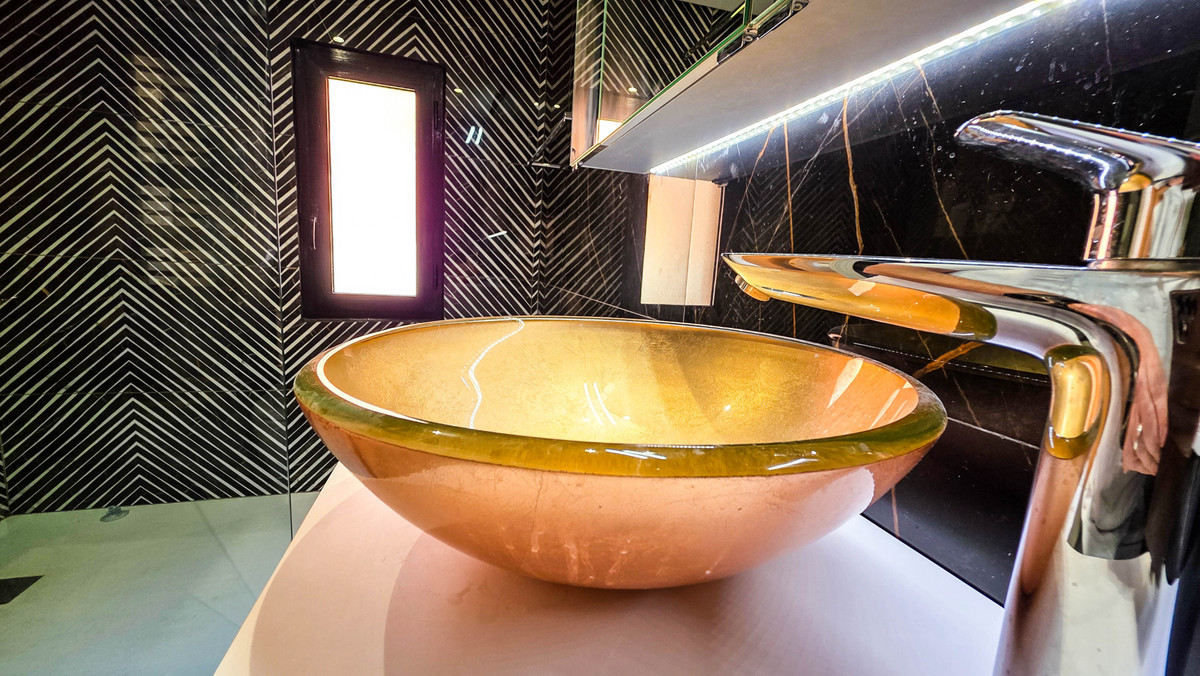 Large sliding doors lead onto a covered terrace fitted with glass curtains, allowing the space to be used throughout the year while still making the most of the panoramic sea views. Whether used for dining, relaxing, or working from home, the terrace becomes a valuable extension of the interior living space.
