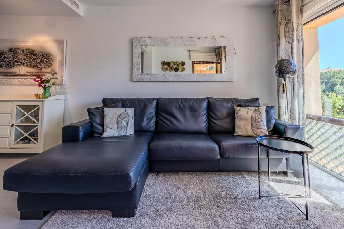The property has a total size of 100 m² and provides two bedrooms with built-in-wardrobes, hall, living-dining room, 2 bathrooms and an open and fully equipped kitchen, and with underfloor heating in the master bathroom. The apartment has been refreshed including new bathrooms (and new airco).