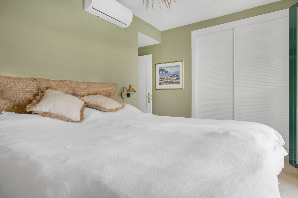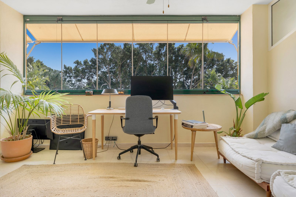 The community Las Acacias is a gated residential complex with 24-hour camera surveillance, entry phone, a beautiful communal pool set in lush mature gardens, and a private covered parking space included. The community is financially solid and well managed, a reassuring detail for buyers. The apartment itself is exceptionally private and peacefully quiet, tucked among mature trees.