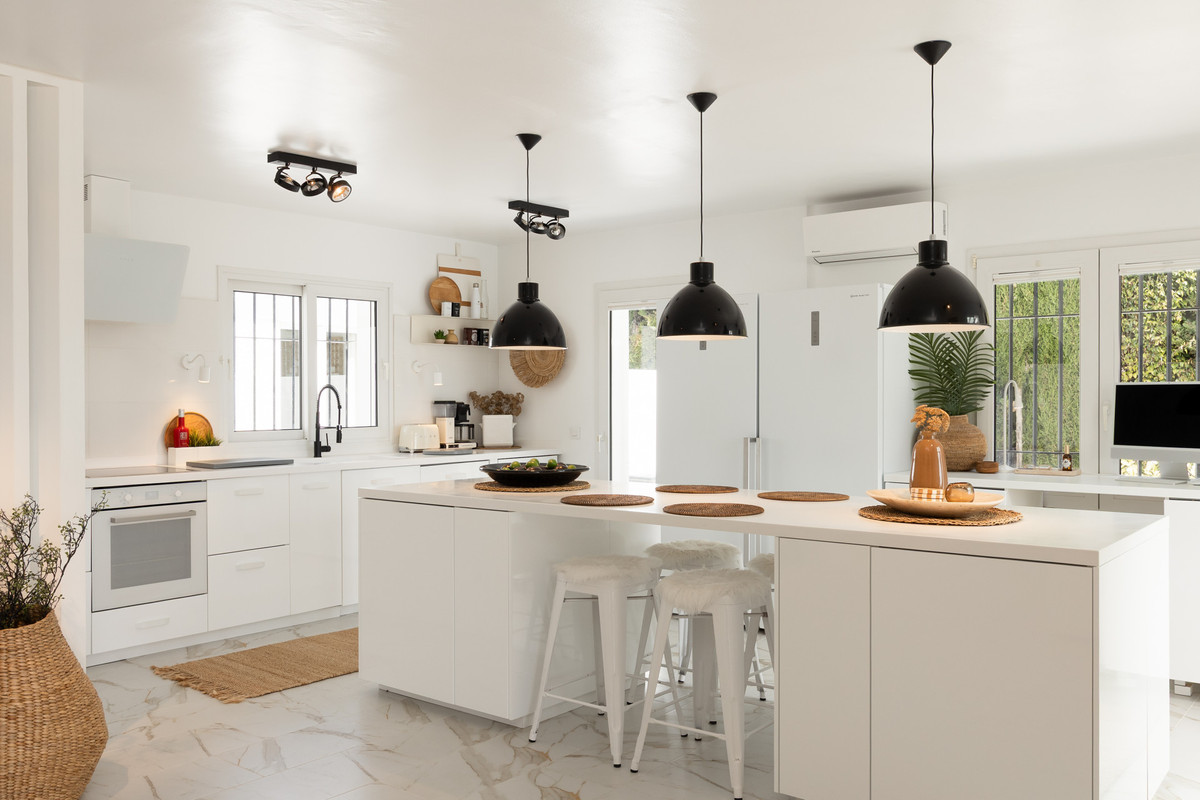A beautifully renovated Andalusian family home with a calm, understated elegance, villa enjoys open southerly sea views from the moment you step through the entrance. The main living level is designed for effortless indoor-outdoor living, with an open-plan kitchen, dining, and lounge area flowing directly onto a generous covered terrace. From here, the views stretch across the pool, the golf course, and out to the Mediterranean, creating an ideal setting for both quiet mornings and relaxed entertaining.