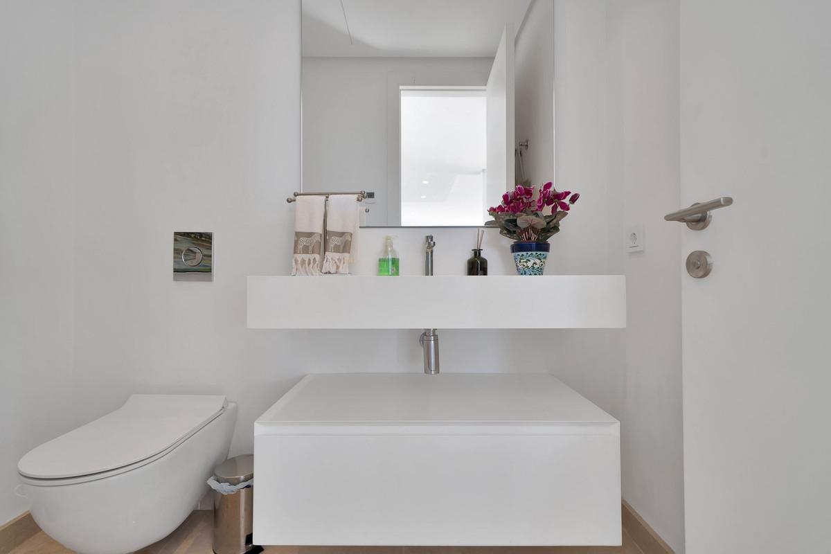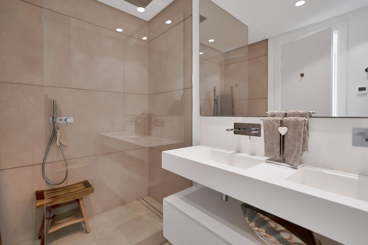 Floor-to-ceiling openings connect the interiors with the outdoor areas, where the private garden and multiple terraces provide ample space for relaxation, sunbathing, or entertaining in complete privacy.