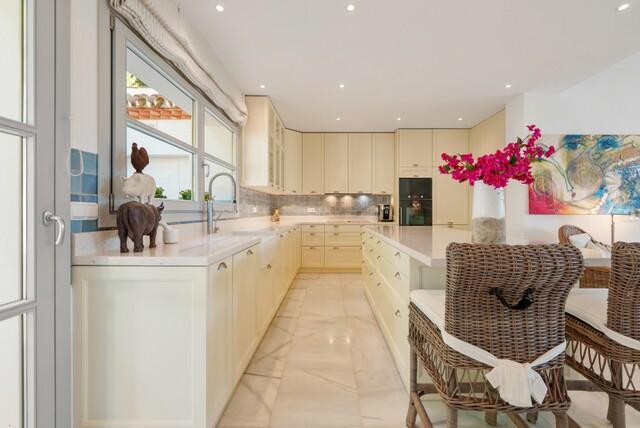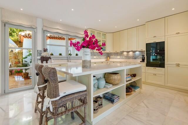 The fully equipped kitchen combines classic elegance with modern functionality, featuring marble countertops, generous storage, and a charming breakfast area with direct terrace access. Underfloor heating in the kitchen and dining areas ensures comfort during cooler months.