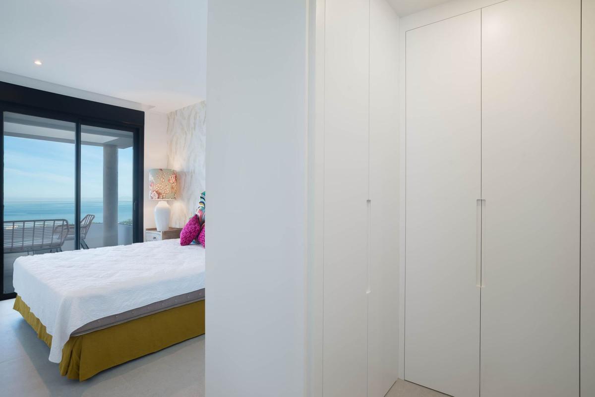 It boasts open sea and mountain views and features two bedrooms, one with an en-suite bathroom, and an open-plan kitchen and living room with stunning sea views. A parking space and storage room are located in the same building.