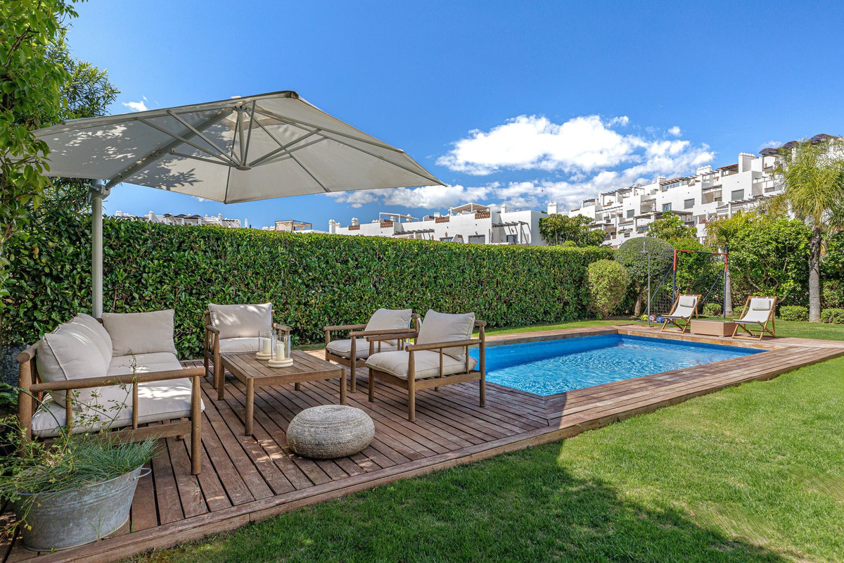 Outside, a private and fully enclosed garden offers a swimming pool, sun deck, and a covered terrace that extends the living space outdoors. It’s a peaceful setting designed for both relaxation and easy entertaining in a green, quiet environment.