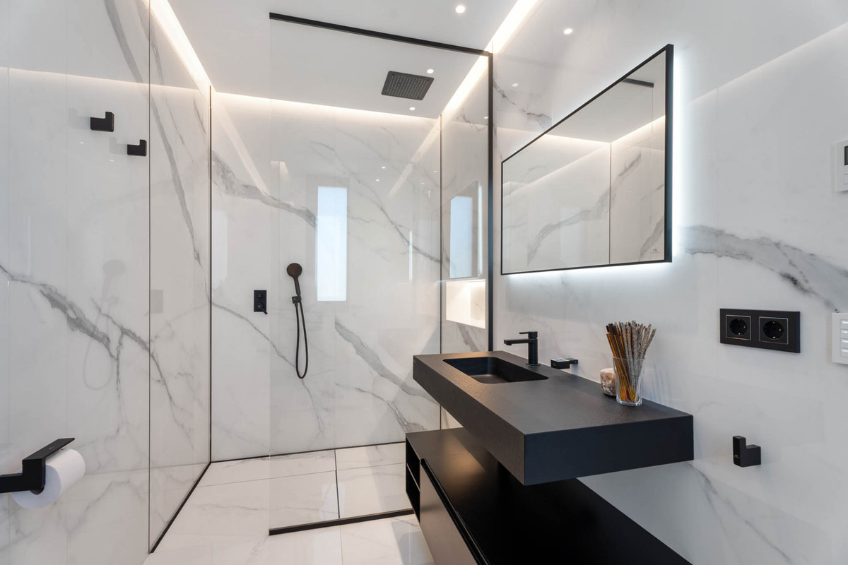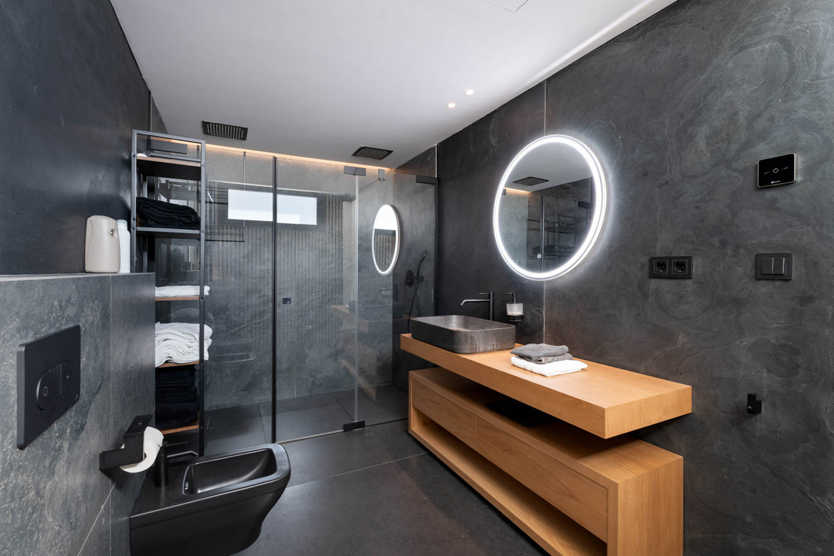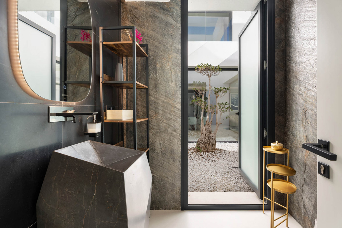 A centralised home-automation system allows remote control of various aspects of the villa, while the high-capacity solar installation contributes to energy efficiency. The overall design prioritises clean lines, balanced proportions and fluid transitions between spaces.