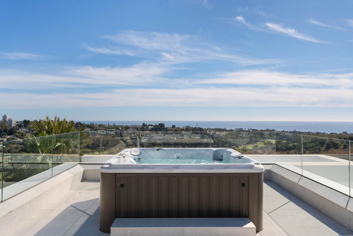 The villa offers six bedrooms, all with en-suite bathrooms designed for comfort and privacy. The primary suite enjoys sea views and access to a private terrace. The upper level includes a solarium with a jacuzzi and panoramic views stretching from the golf course to Africa, providing a dedicated space to take in the surroundings from the highest point of the property.