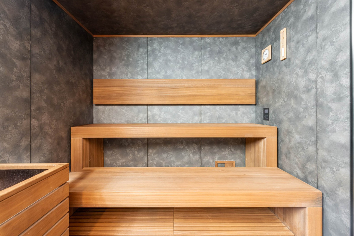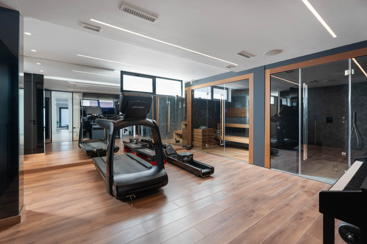 The lower level houses the wellness and entertainment areas, including a cinema room, gym, sauna and an independent space designed for gatherings. The property also features a large garage with turning platforms to facilitate easy manoeuvring.